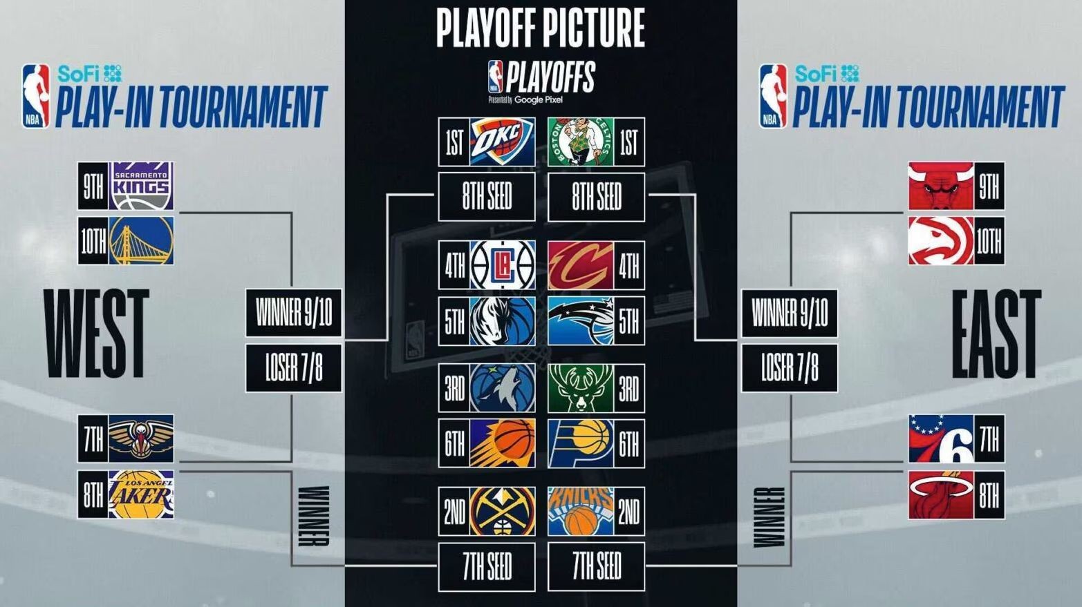 В турнире плей-ин от Востока сыграют «Филадельфия Сиксерс» (7-е место), «Майами Хит» (8-е), «Чикаго Буллз» (9-е) и «Атланта Хоукс» (10-е), а от Запада — «Нью-Орлеан Пеликанс» (7-е место), «Лос-Анджелес Лейкерс» (8-е), «Сакраменто Кингз» (9-е) и «Голден Стэйт Уорриорз» (10-е).